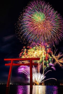 北浦に立つ「西の一之鳥居」の背後に約1万発の花火が打ち上げられる花火大会。湖面に映る一之鳥居と夜空を彩る花火は必見。