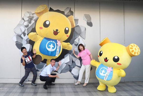 茨城県土浦市大和町の市役所本庁舎ビルの外壁に、同市のマスコットキャラクター「つちまる」を描いたトリックアートがお目見えした。さらなる発展へ願いを込め、つちまるが壁を壊して勢いよく飛び出す絵柄になっている。