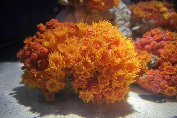 展示されるのは、もふもふしたコキアのような丸い形状が特徴の「イボヤギ」。同館によると、比較的温暖な海に生息するサンゴの仲間で、岩陰にいることが多く、花が咲いたようにポリプが開く。秋らしい温かみのあるオレンジ色で、秋風にそよぐコキアに似ているという。
