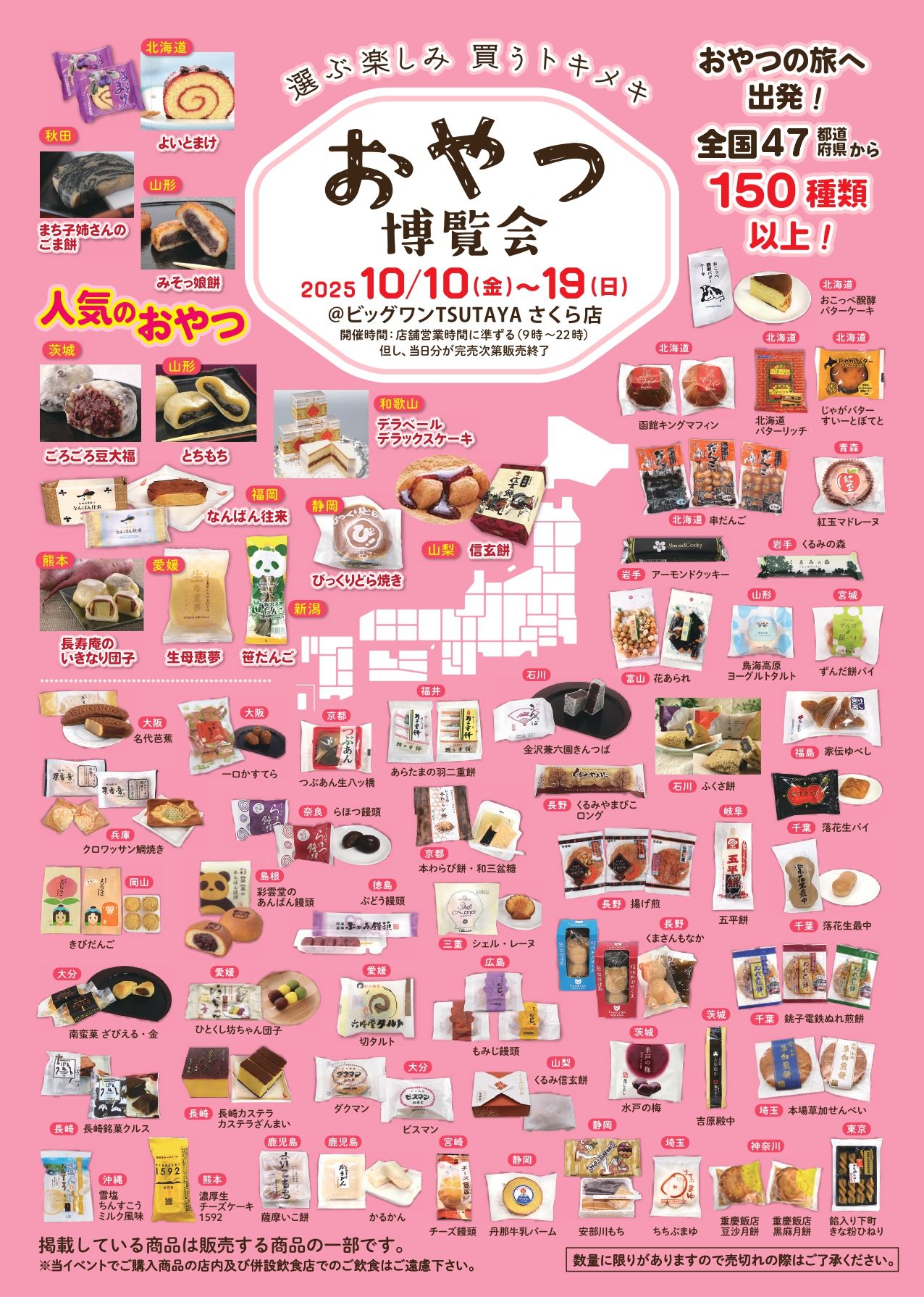 全国のご当地おやつを集めたイベント「おやつ博覧会」が10月10日、栃木県さくら市桜野のビッグワンTSUTAYAさくら店で始まる。
