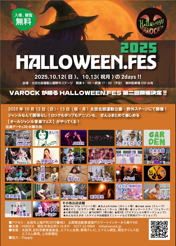 群馬県桐生市にあるライブハウス「VAROCK」が、12、13の両日、太田市上強戸の太田市北部運動公園野外ステージで音楽イベント「ハロウィンフェス」を開催する。ロックにポップ、アニメソング…とジャンルにこだわらないオールジャンル音楽フェスとなる。