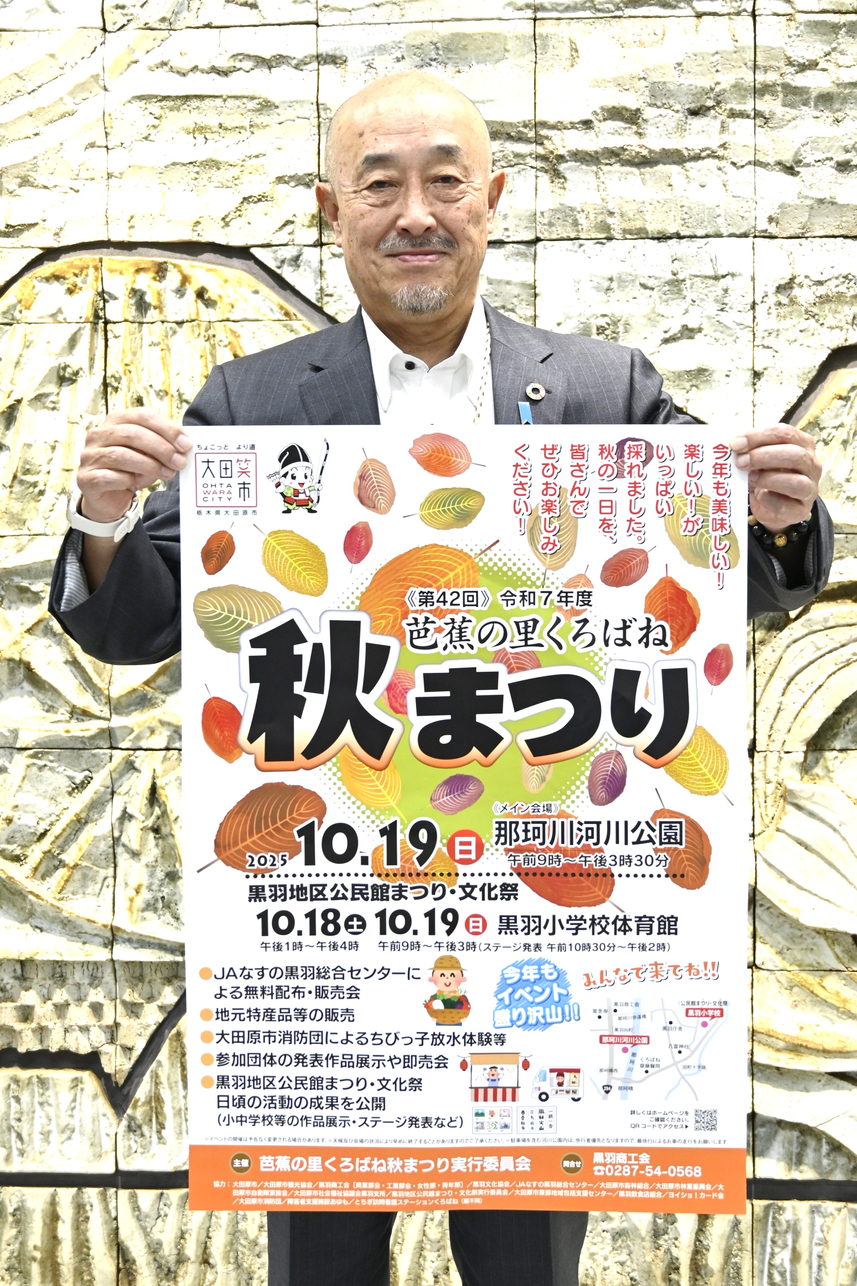 栃木県大田原市や大田原市観光協会、黒羽商工会などでつくる「芭蕉の里くろばね秋まつり実行委員会」の郡司昌尚委員長が7日、下野新聞社を訪れ、19日に大田原市黒羽向町の那珂川河川公園で開催する第42回秋まつりをPRした。