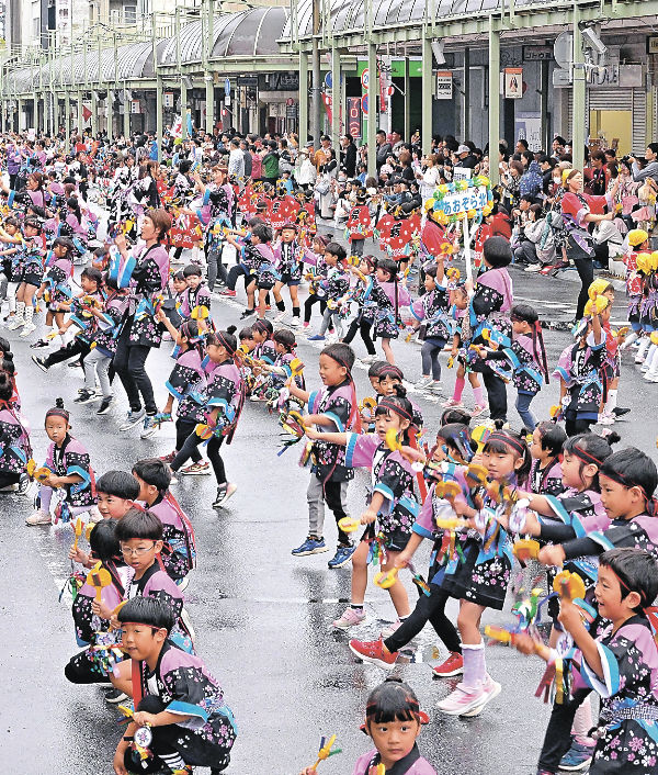 第77回前橋まつりが11、12日、群馬県前橋市の中心市街地で開かれた。小雨の中、市民がだんべえ踊りや和太鼓演奏で盛り上げ、飲食の露店に列ができるにぎわいを見せた。子どもだんべえ踊りには園児約1000人が参加し、鳴子を手に元気よく踊った=写真。