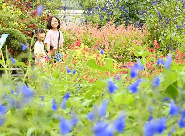 サルビアはシソ科サルビア属で国内外に900種類以上あるとされる。同公園では現在「サルビアガーデンフェア」が開かれ、約60品種約1300株を展示。中でもサルビアガーデンには、さまざまな品種が集められており、来園者は花に囲まれながら写真撮影をしたり、色鮮やかな花の小道を散策したりするなどしている。