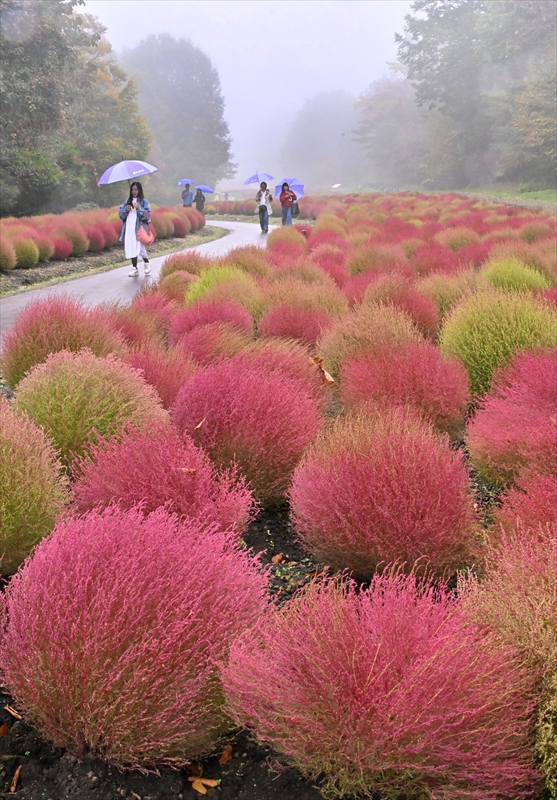 たんばらコキアガーデン(群馬県沼田市上発知町)で1万株のコキアが紅葉し、園内を散策する観光客を楽しませている=写真。