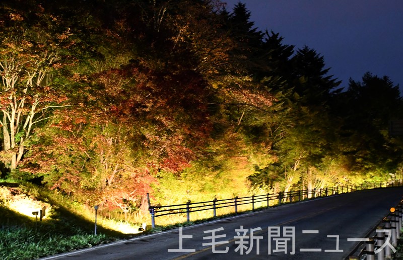 群馬県草津町の道の駅「草津運動茶屋公園」周辺の木々が赤や黄色に色づき、草津温泉観光協会が国道292号沿いの約100メートルの区間でライトアップを行っている=写真。