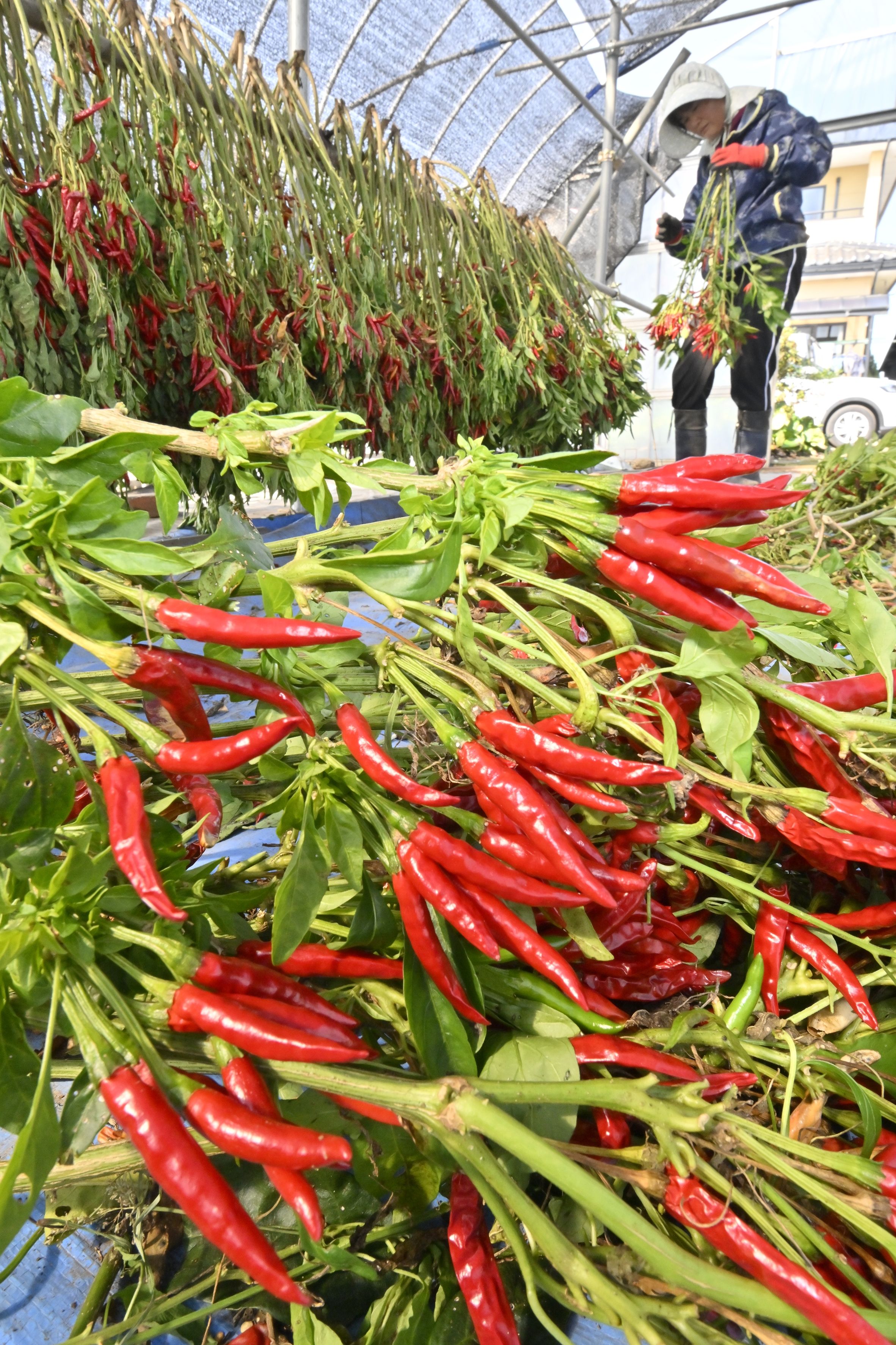 木下さん方では5aの畑で栽培。この日は青空の下、赤く色づいた実のなる株を根元から手際よく刈り取り、乾燥させるためビニールハウス内につるして干していった。