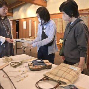 地域おこし協力隊の徳本萌子さん(32)と田中彰(36)さんも出展。徳本さんはミシンで葉っぱを縫うことで制作した平面・立体作品や渡り鳥をテーマにした力作を用意。田中さんは「シティプロモーション」を担っており、特産品のアンコウや景勝地「二ツ島」などを題材に制作した版画を出品する。