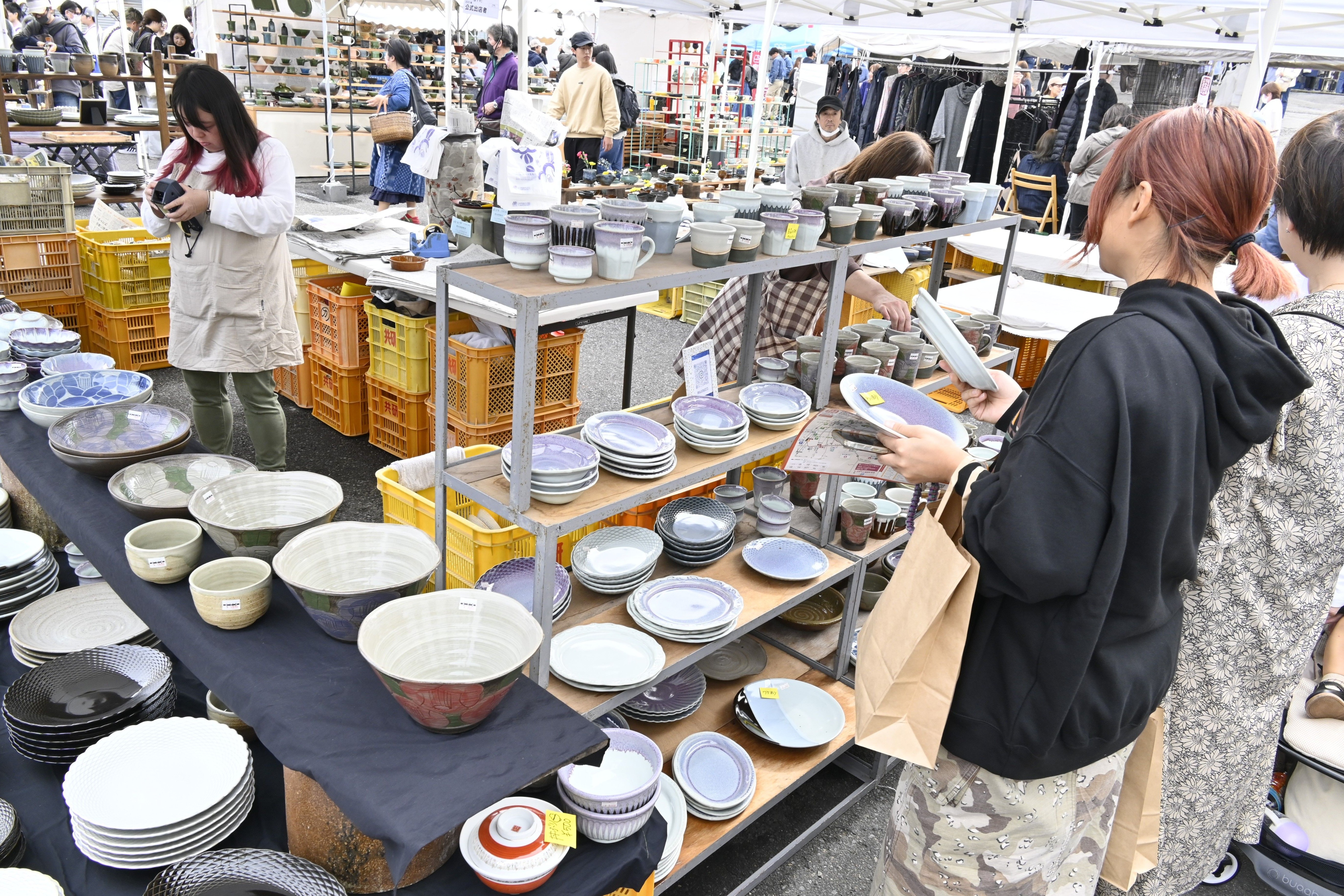 会場には目移りするほど多種多様な陶器、グルメや雑貨、農産物などがずらりと並んだ。来場者は商品を手に取って吟味したり、作家から話を聞いたりして、お気に入りの作品探しに夢中になっていた。