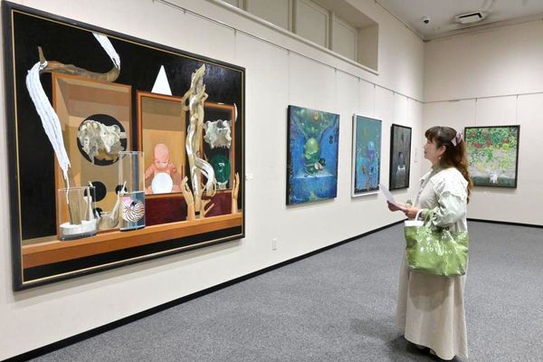 絵画と工芸は東京都内で5月に行われた同会本展出品作など計32点を展示。山田幸夫支部長(絵画部・工芸部)(67)の油彩画「連鎖」は、スピーカーの周囲に赤ちゃんや牛の頭蓋骨を描き「身の回りの声を聞こう」という思いを込めた。前支部長(同)の横須賀幸正さんの遺作も並ぶ。