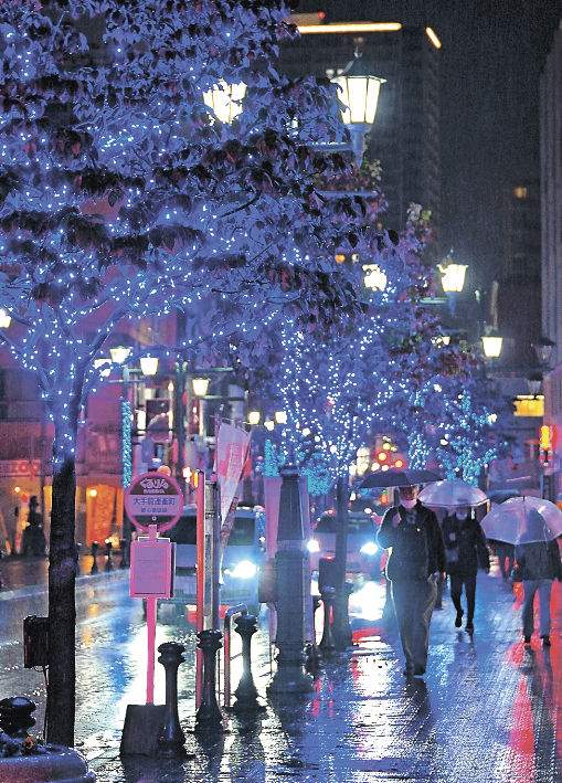 街中がイルミネーションで彩られる群馬県高崎市の冬の風物詩。市中心部を通る慈光通りがブルーのLED電球を配置した「青の通り」となり、高さ約6メートルのフラワーツリーにも光がともされている。