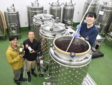 山口さんは市内で大正時代から続く酒卸問屋「合名会社山口」の4代目。近隣のブドウ園が高齢化や後継者不足によって耕作放棄されていく現状に、「産地を維持しなければ」と危機感が募った。「ものづくりをしてみたい」という思いも重なり、醸造所設立を決意。2016年に「常陸コミュニティデザイン」(同市)を立ち上げ、社員の成田楓さん(24)、武関拓也さん(40)と3人で22年からワインの仕込みを行う。