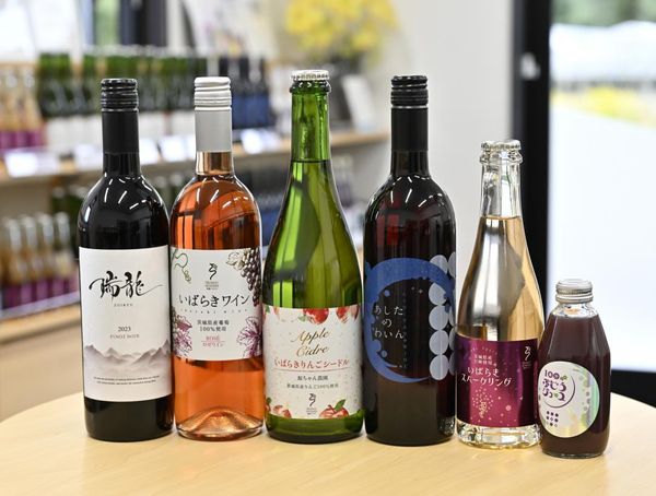 自社栽培ブドウを使った「瑞龍」や農家から毎年約5トン買い取る規格外ブドウで仕込む「いばらきワイン」、県立常陸太田特別支援学校高等部の生徒たちと栽培から仕込みまで行う「あしたのわいん」やブドウジュースなど約20商品をそろえる。同県日立市、同県大子町の3農家が育てたリンゴのシードルも販売する。