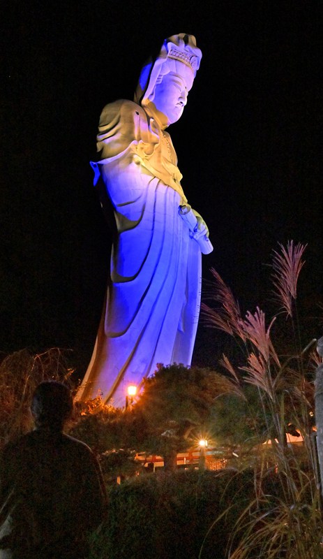 糖尿病の予防や適切な治療の大切さを呼びかける「世界糖尿病デー」(11月14日)に合わせ、群馬県糖尿病協会は県内の名所や公共施設をシンボルカラーの青色にライトアップしている。高崎市の高崎白衣大観音は15日まで、日没~午後10時に幻想的な光に浮かぶ=写真。