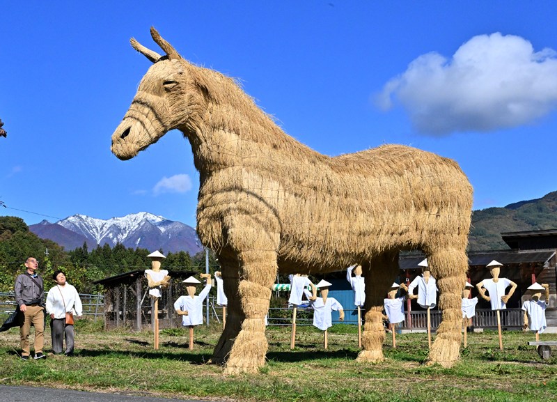 来年の干支(えと)の「午(うま)」にちなんだ、わらアートの巨大な「馬」が群馬県みなかみ町の道の駅「たくみの里」周辺に登場し、観光客らを楽しませている=写真。