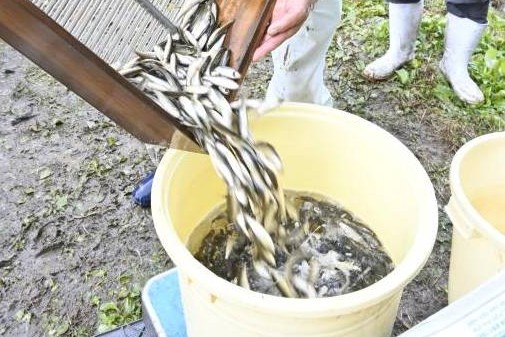 この日は研究会の5人ほどが作業。養殖池から水を抜き、流れてくる10cmほどのホンモロコをすくい集めた。研究会のホンモロコは町内の川魚店に卸される。