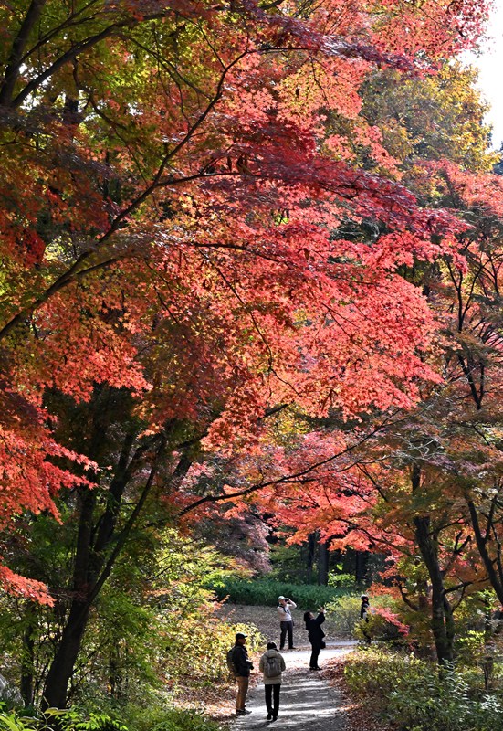 普段は通ることができない整備車両用の道路にある「イロハモミジのトンネル」が、群馬県渋川市の赤城自然園で特別公開され=写真、ハイカーや写真愛好家らが散策を楽しんでいる。