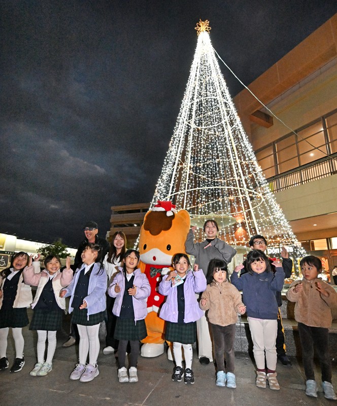 近くの静和幼稚園の年長児がクリスマスソング2曲を披露。園児らはきらびやかなツリーの前で踊ったり、撮影したりしていた=写真。大塚千歳ちゃん(5)は「クリスマスが楽しみになった」と声を弾ませた。
