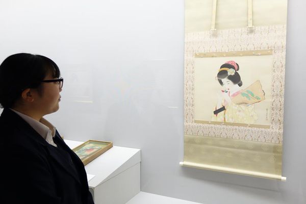 企画展では、伏し目がちに羽根突きの羽根と羽子板を手にする「羽子」や、ほろ酔い姿を捉えた初公開の作品「微醺」といった美人画が並ぶ。同じく初公開で雪化粧の家並みなどをびょうぶに描いた「雪景」や、松竹梅の羽子板も見どころだ。