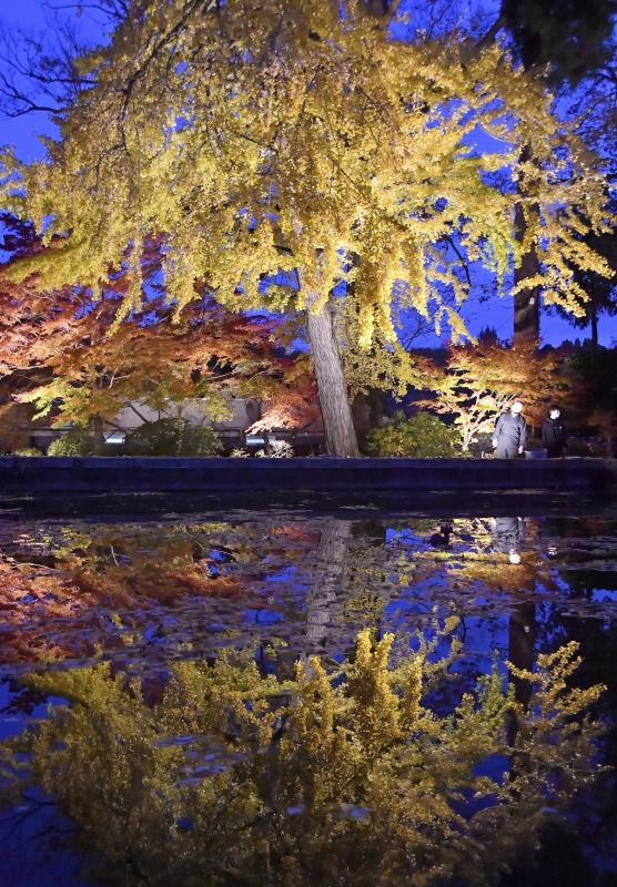 620年以上の歴史がある円通寺には約500本のモミジなどがあり、20日現在、本堂周辺の木々の色づきがピーク。この日夕、イチョウがある池のほとりでは葉の黄と赤、空の深い青が水面に映えた。