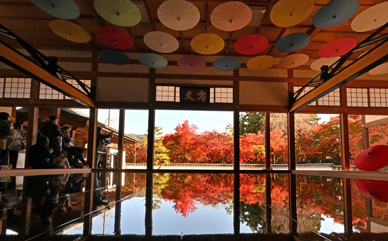 磨き上げられた床に浮かぶ紅葉と、天井を飾る色とりどりの 傘とが織りなす光景が広がり、拝観者は夢中でシャッターを切っていた。金子英宗住職は「夏の猛暑に耐え、今年も鮮やかに色付いてくれた」と話した。