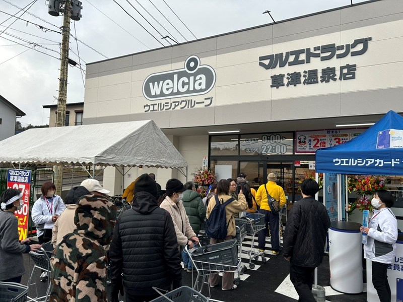 ドラッグストアの「マルエドラッグ草津温泉店」(群馬県草津町草津)が27日、オープンした。運営するクスリのマルエ(群馬県前橋市樋越町)によると、草津町への出店は初めて。地元住民ら30人が開店前から列をつくった。