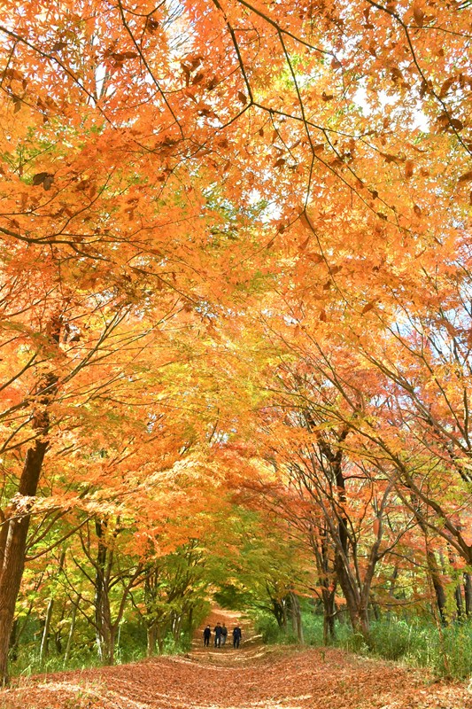 “天空の回廊”として親しまれる、群馬県安中市板鼻の「天神山自然の森」で紅葉が見頃を迎えた。遊歩道沿いにモミジがずらりと立ち並び、秋色に染まっている=写真。