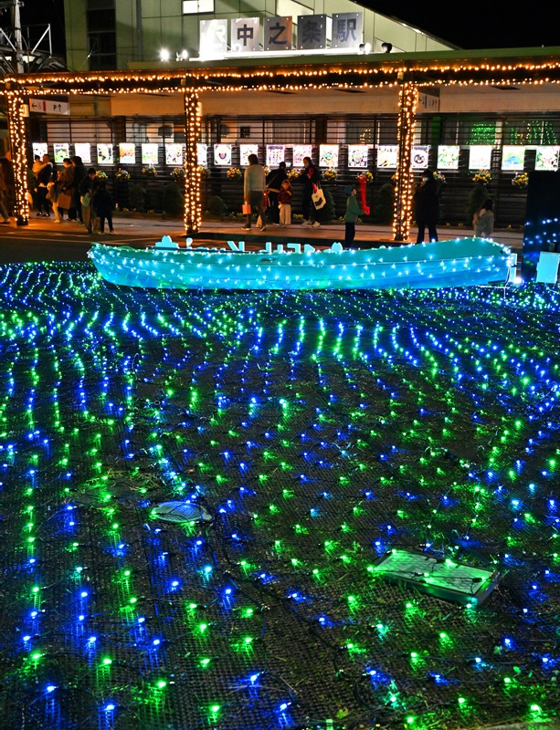 緑や青のLED2万個がJR中之条駅前を神秘的に彩る 群馬・中之条町の町制70年・合併15年を記念