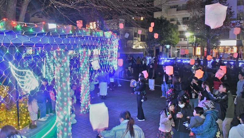 点灯イベントは同法人が主催。参加者が自身で絵を描いたランタンを夜空に放ち、電飾との光の競演を楽しんだ。
