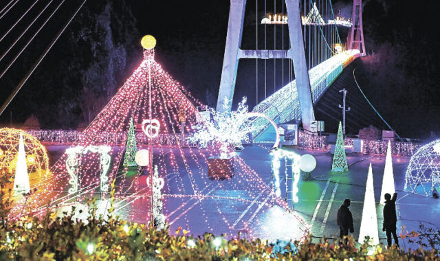 全長225メートルの吊り橋を約90万球でライトアップした県内最大級のイルミネーション。車の乗り入れ制限があるため道の駅上野から無料シャトルバスを運行する。