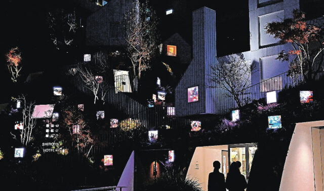ホテルの開業5周年を記念し、写真家で映画監督、現代美術家の蜷川実花さんと科学者の宮田裕章さんらがつくるグループ「EiM」が手掛けたアートイルミネーション作品「Pulse of Lives」が展示され、約50枚のLEDパネルに花やチョウ、金魚、雑踏などの映像が次々と映し出され、幻想的に彩っている。