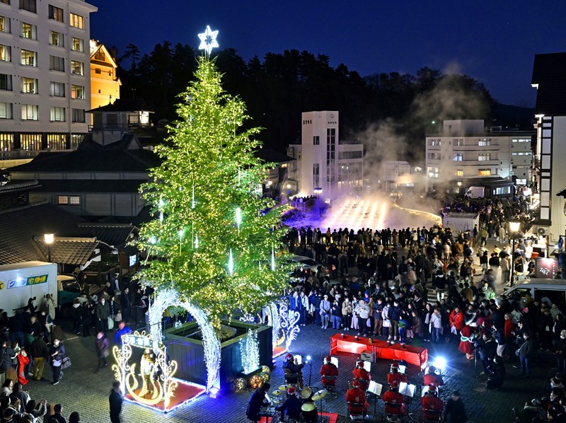 2018年に冬の新たな誘客策として誕生、草津町商工会が運営し8年目を迎えた。今季は温かみのあるイエローゴールドを中心に3万球の電球で装飾。11月下旬の点灯式は草津中吹奏楽部の演奏が花を添えた。同商工会青年部は今年、ツリーに隣接した湯畑湯路広場の回廊と棚田に1万4000球のイルミネーションを設置し、にぎわいを増している。