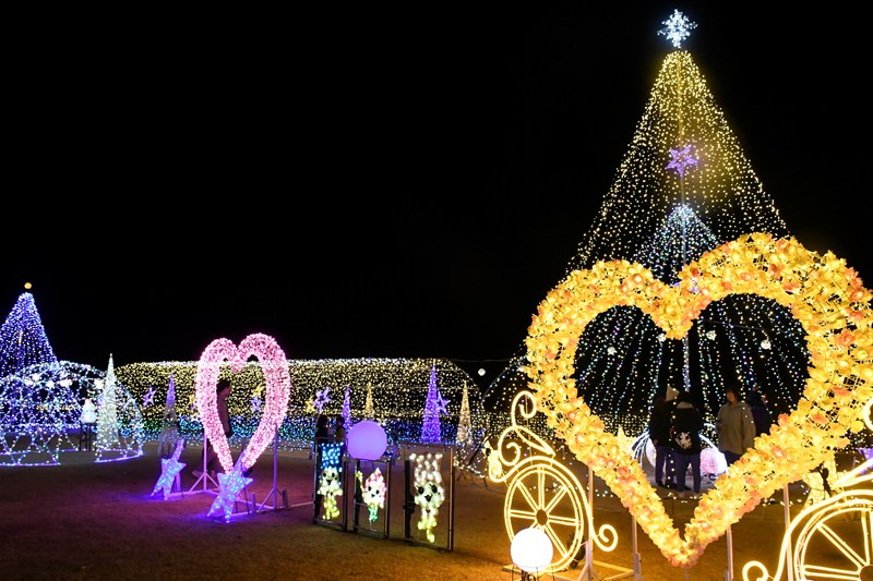 2018年に始まり、今年で8回目。光のトンネルやツリー形、ハート形の装飾などが輝き、幻想的な世界を演出している。来場者はお気に入りの場所や“映えスポット”を探し、記念撮影していた。