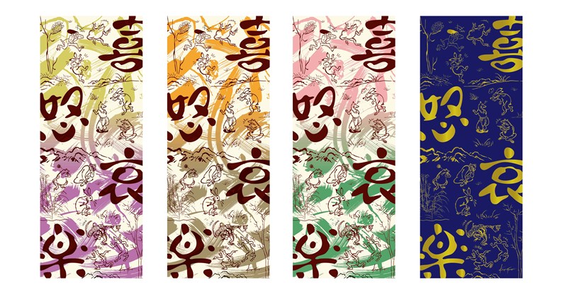 高山寺(京都市)の公認を受け、国宝「鳥獣人物戯画」の絵を基にした。喜怒哀楽の豊かな表情を浮かべる擬人化した動物と、3種類のグラデーションを施したデザインが特徴。紺地に金箔(きんぱく)で絵柄をあしらったものもある。手拭いは同社独自の手捺染技術で、一枚一枚職人が染め上げている。