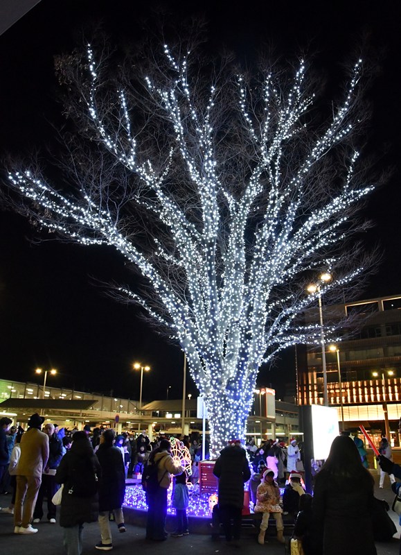 群馬県前橋市のJR前橋駅で、ケヤキのイルミネーションが来年2月28日まで点灯している=写真。色鮮やかな光が北口ロータリーを温かく照らしている。