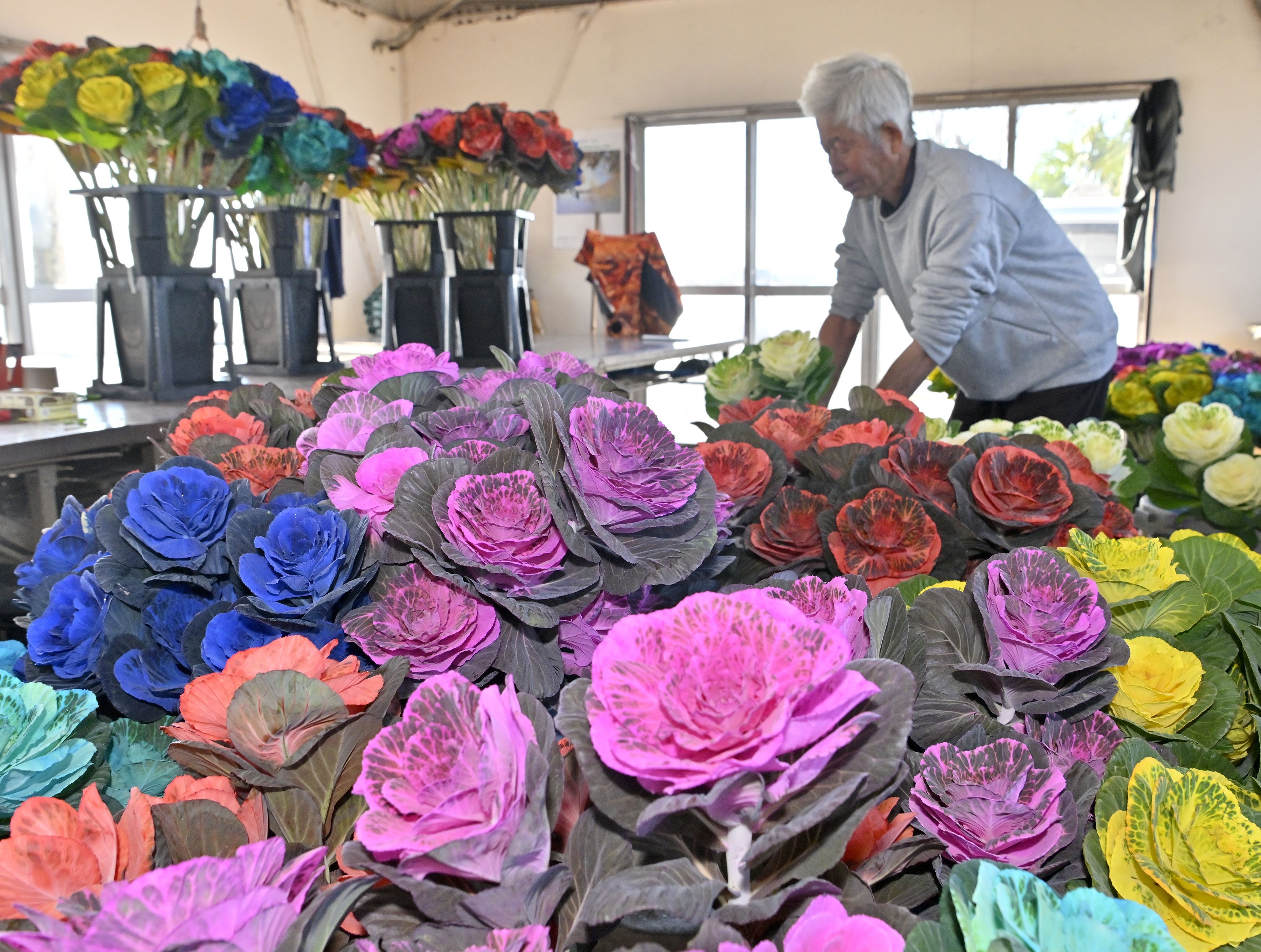16日も木村一喜代表(74)が、約70cmの高さに育った葉ボタンを丁寧に収穫。ピンクや赤、青などの着色料に茎を浸していった。最短2時間で鮮やかに染まり、1日当たり約700~800本の色付け作業を行っていく。