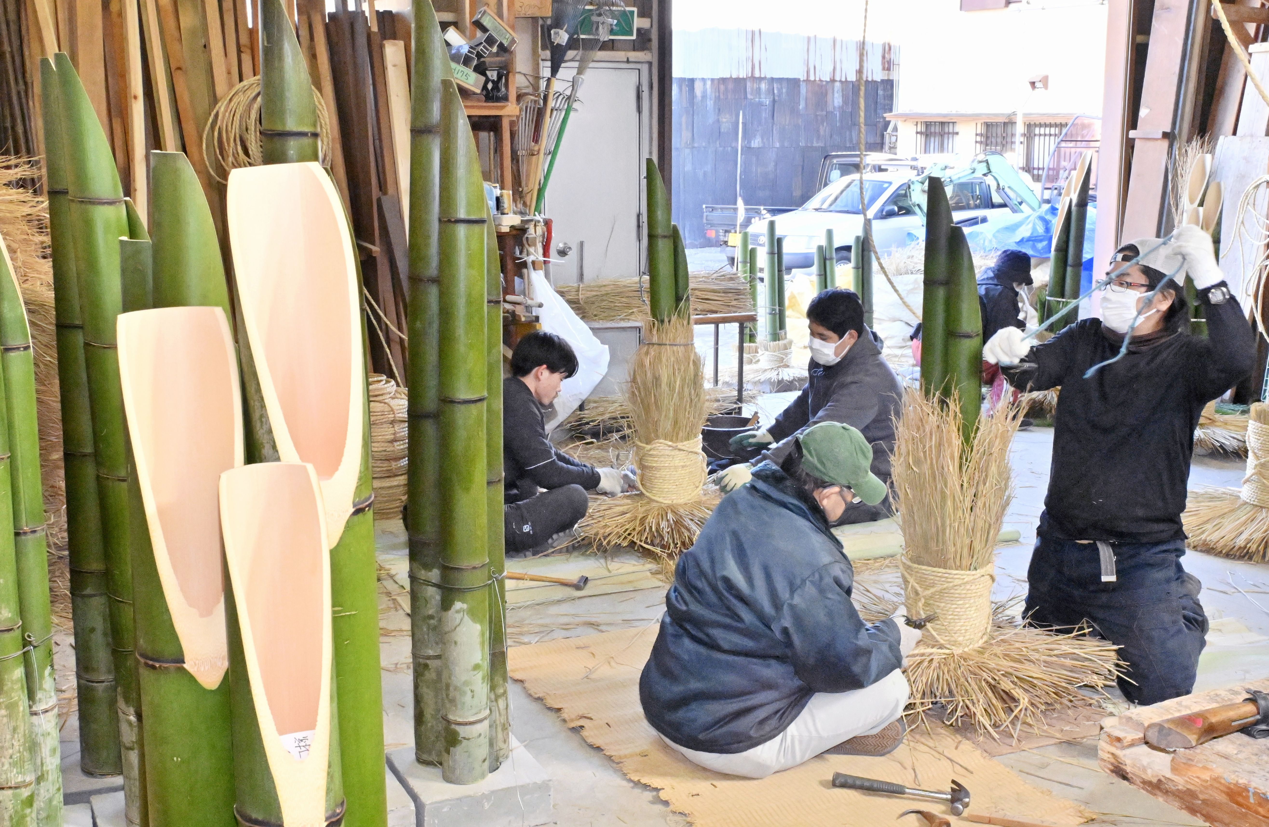 18日は、作業場で従業員が市内の竹林農場から仕入れた孟宗竹をコンクリートの台座に固定。わら縄を巻き松の枝や水引などを飾り付け、テンポよく門松を完成させた。