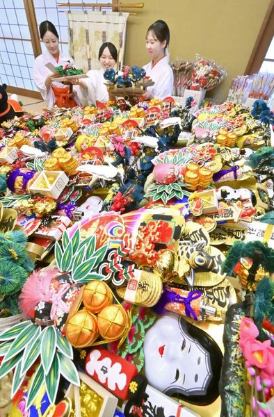 熊手は正月の縁起物。小判や米俵、福の神、タイなどで豪華に装飾されている。21日は高さ約1メートルの大型から手のひらサイズまで約10種類が集められた。巫女たちは「災いがないように。平穏な年になるように」などと願いながら、熊手を仕上げていた。