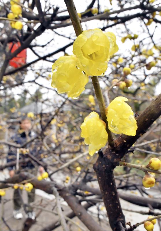 栃木県芳賀町西水沼の芳賀天満宮でロウバイが開花し、透き通るような黄色い花が境内を彩り始めた。