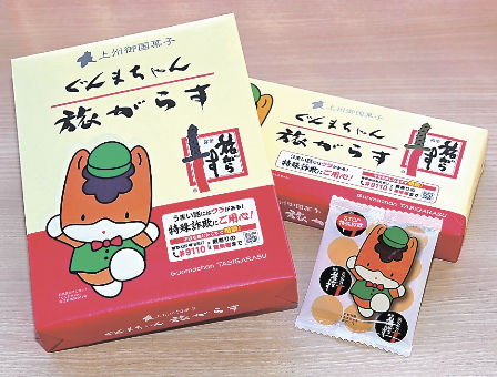 群馬県マスコットのぐんまちゃんをあしらった商品の包装に「うまい話にはウラがある!特殊詐欺にご用心!」と大きく記した。