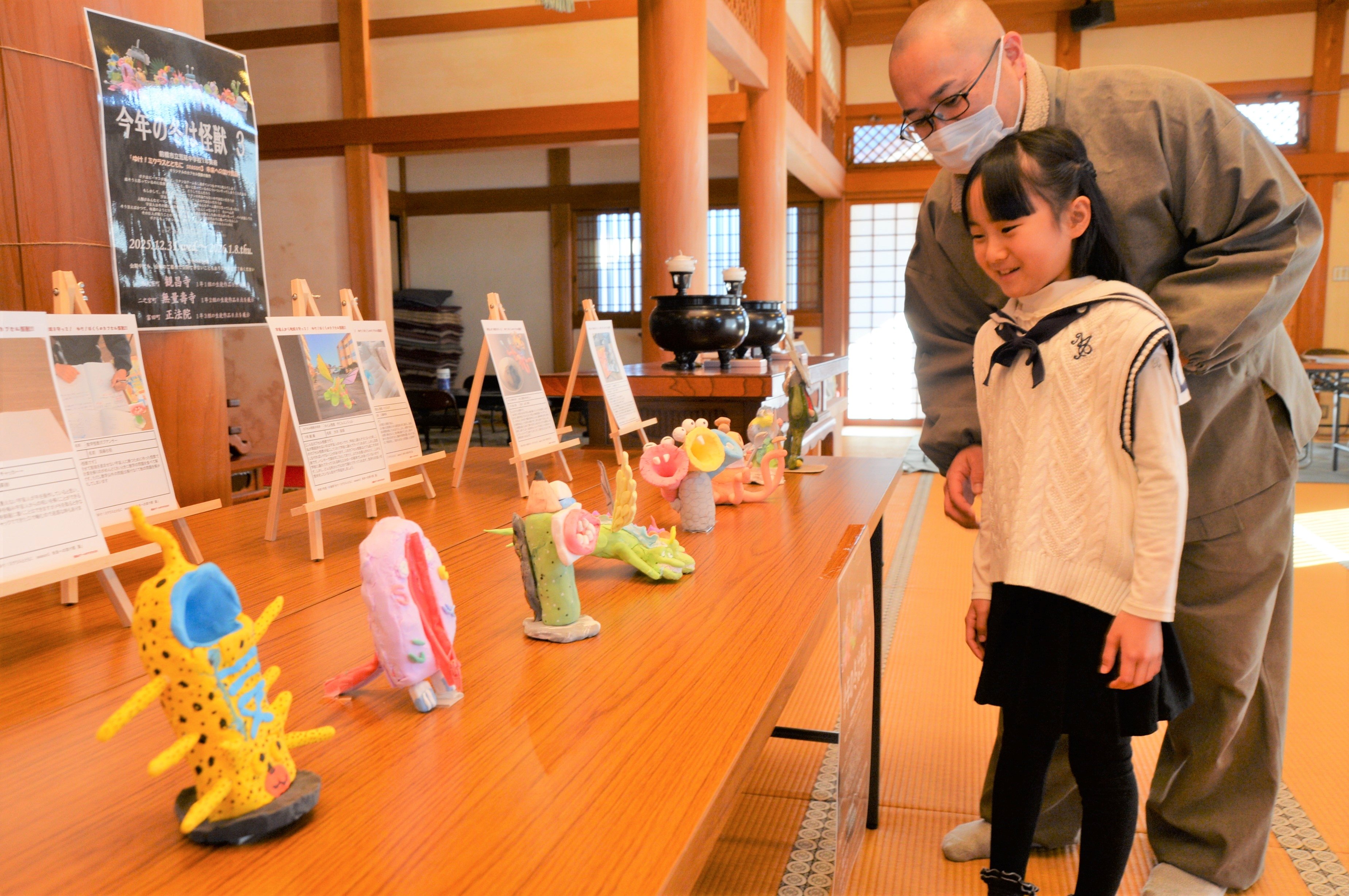 群馬県前橋市の荒砥中の1年生が美術の授業で空想して粘土で作った、自分を助けてくれる「怪獣」の展示が8日まで、校区内3寺で開かれている。愛嬌(あいきょう)のある各8体が正月の参拝者を出迎える。