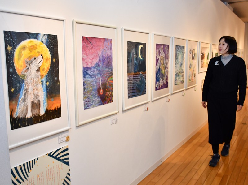 群馬県前橋市出身の詩人、萩原朔太郎の作品をテーマにした絵画展「わたしが描く朔太郎の世界」が4日、前橋文学館で始まった。市内の小中学生が応募した158作品の中から選ばれた40点が飾られている。20日まで。