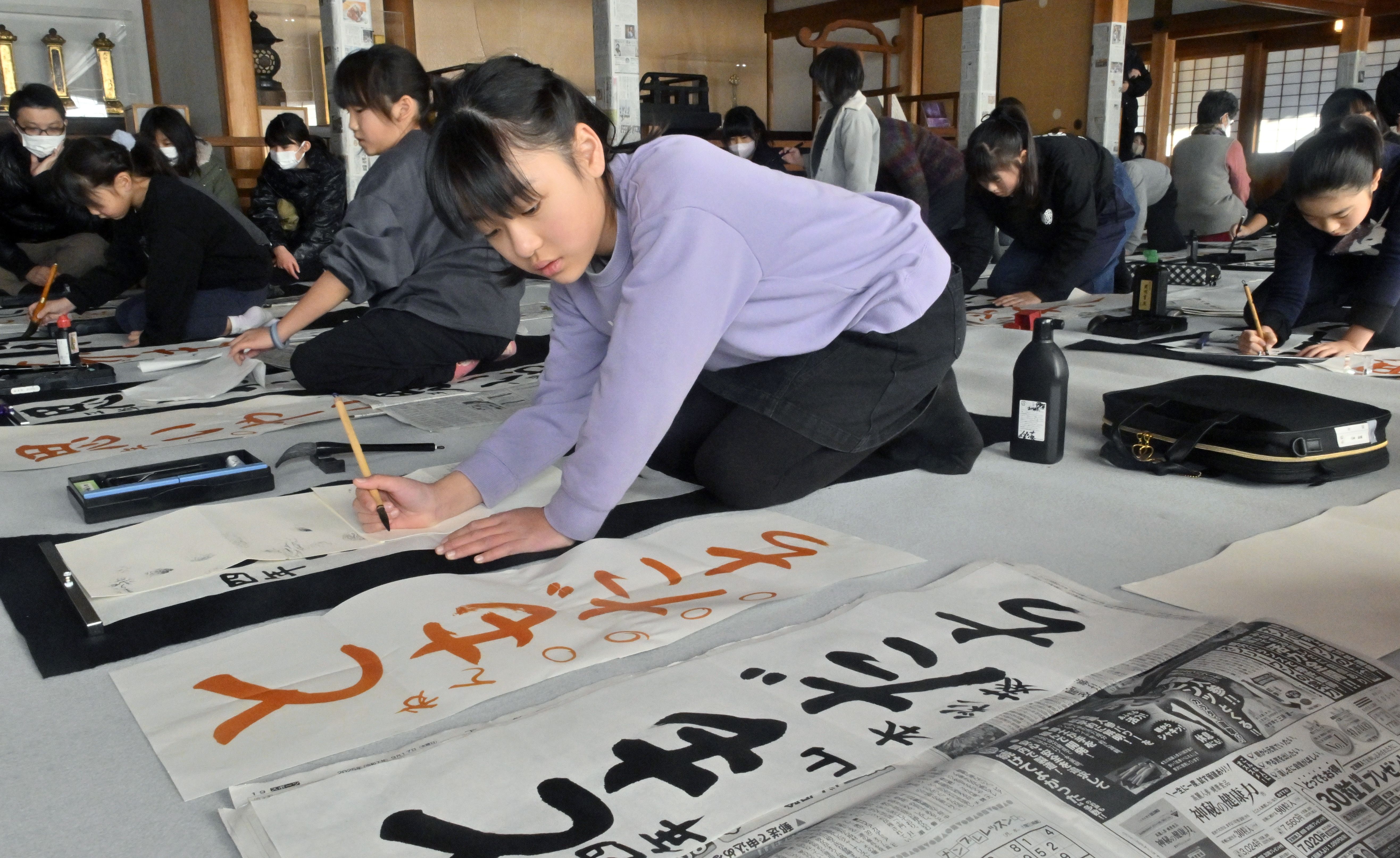 栃木県足利市昌平町の史跡足利学校で6日、毎年恒例の新春書き初め会が開かれた。市内の小中学生20人が参加し、論語にまつわる言葉をしたためた。