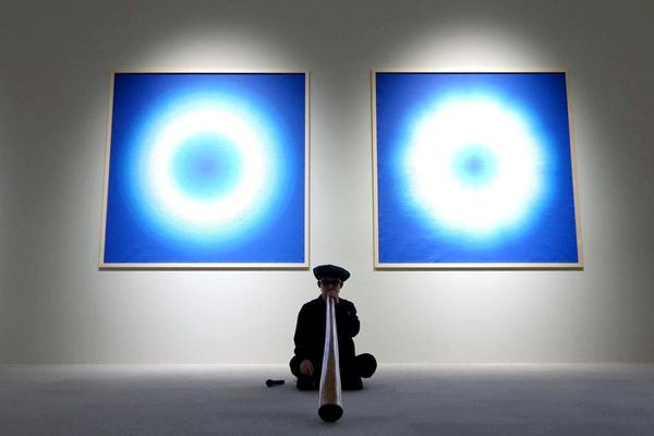 企画展が開幕した昨年12月20日のギャラリーツアーで、GOMAさんは「ひかりの世界」について「生と死の間のどこかの段階に確実に存在する」と説明。ディジュリドゥでミニライブを行い、巧みな演奏で来場者を魅了した。