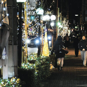 街中がイルミネーションで彩られる群馬県高崎市の冬の風物詩。市中心部を通る慈光通りがブルーのLED電球を配置した「青の通り」となり、高さ約6メートルのフラワーツリーにも光がともされている。