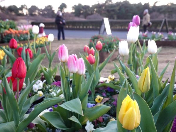 閉園間際のレストハウス付近に70代男性と50代女性が愛玩犬を連れて立ち寄る姿が見られた。女性は「花を背景に(犬を)撮りたいのだが、昼間は人が多いので避けて、あえてこの時間を狙った」と話し、人影のない花壇の前で心おきなくシャッターを切った。