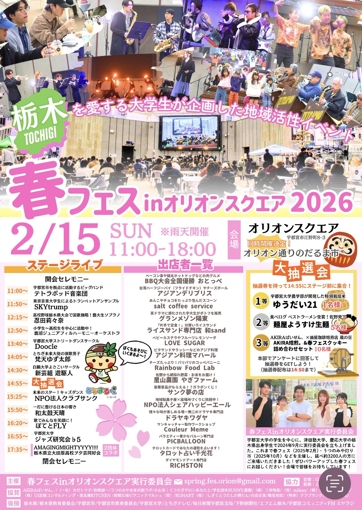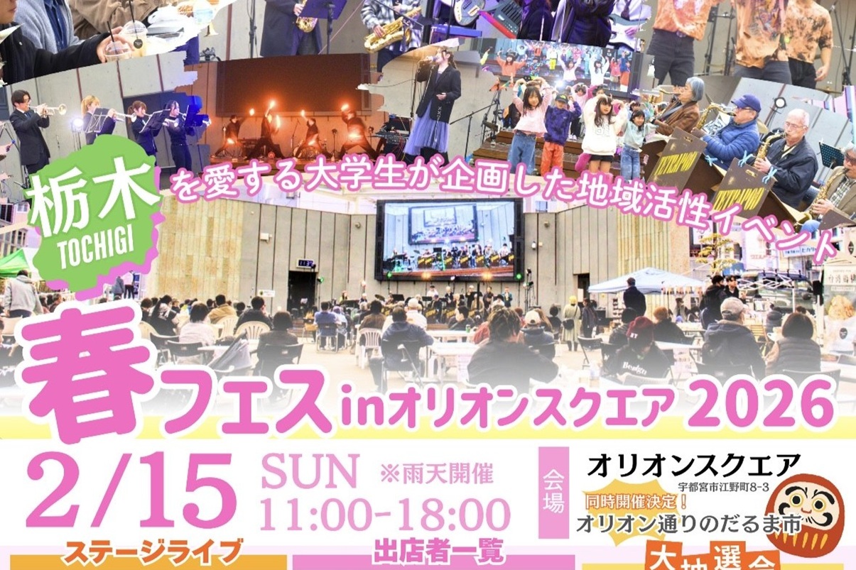 栃木県宇都宮市江野町のオリオンスクエアで15日、栃木県出身の大学生たちが企画するイベント「春フェスinオリオンスクエア2026」が開催される。キッチンカーなどが出店するほか、ステージライブや県産品が当たる抽選会も行われる。