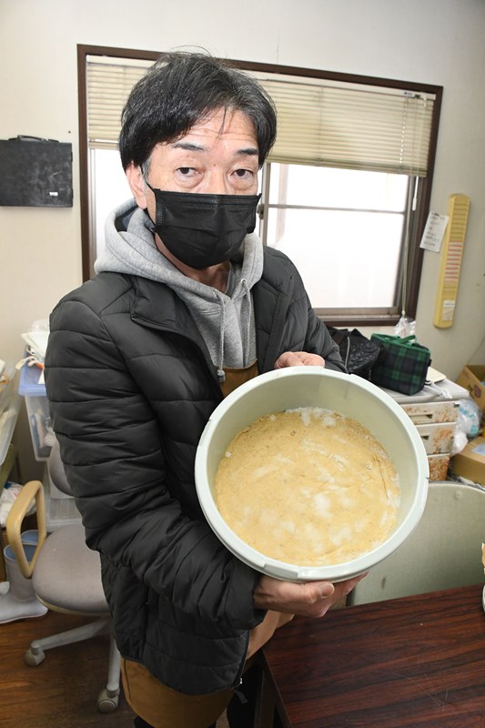 原料には、利根沼田産の大豆と町産のコメ、塩のみを使用。すりつぶした大豆と自家製の米こうじを一対一の割合で混ぜるため、甘みが強くなる。寒さの厳しい冬に作る「寒仕込み」で、雑菌の繁殖を抑えられるという。飛田勝駅長は「同じみそでも保存環境によって味が変わってくる。熟成の楽しさを味わってほしい」と話している。