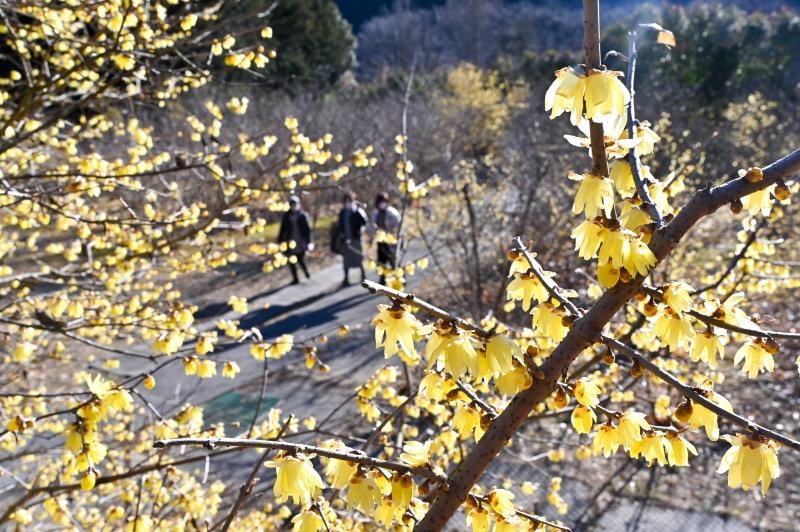 栃木県鹿沼市上永野の観光施設「蝋梅の里」で、ロウバイが見頃を迎え、冬の山あいに甘い香りを漂わせている。