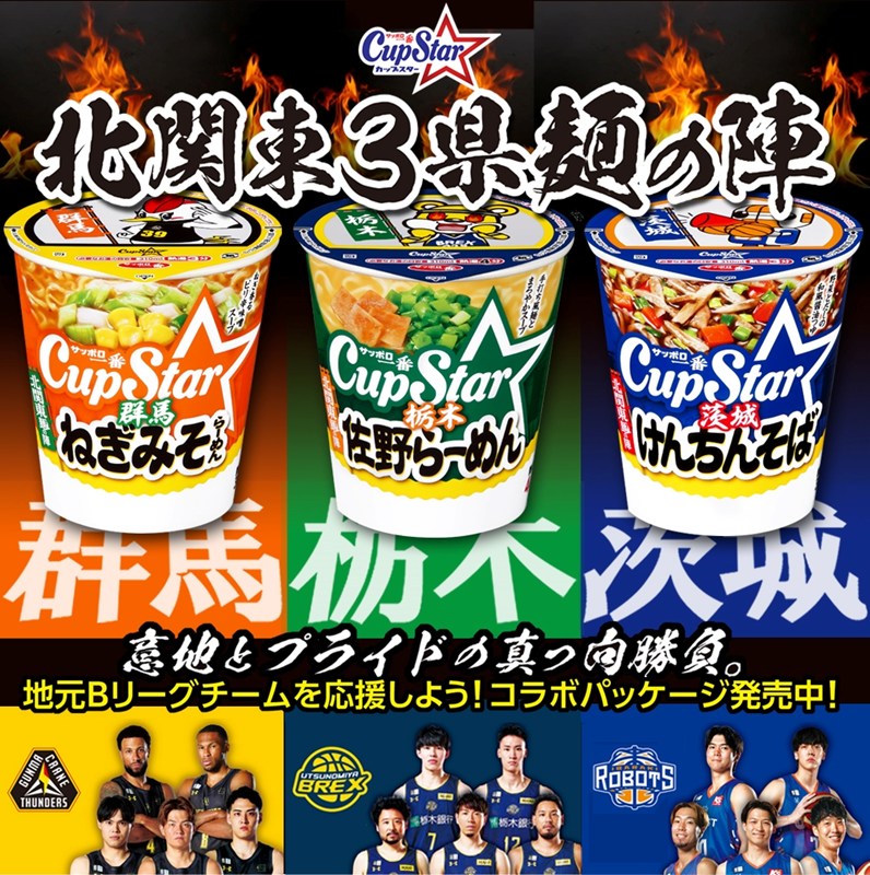 群馬県前橋市に本社工場があるサンヨー食品(東京都)は2月2日、「北関東3県麺の陣」と称して、群馬、栃木、茨城3県のバスケットボール男子Bリーグのチームをデザインした「サッポロ一番 カップスター」を数量限定で発売する。